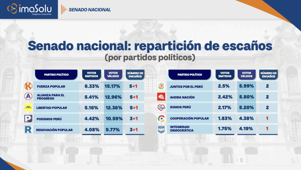 Asimismo, agrupaciones como Somos Perú, Juntos por el Perú y Ahora Nación se ubican en el límite de la valla electoral, lo que podría definir su ingreso o exclusión.