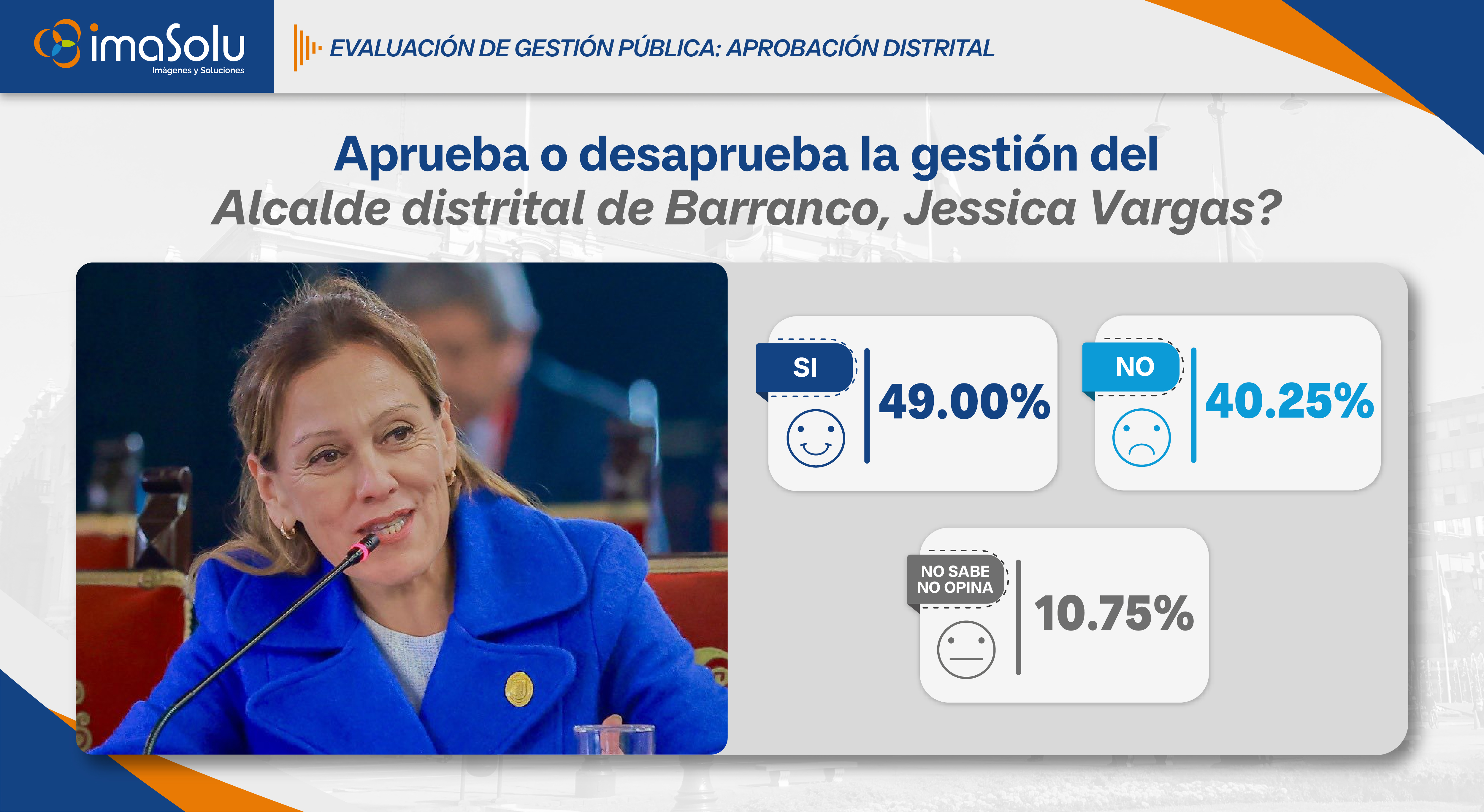 Aplicado en enero de 2026, el estudio muestra que en Barranco la gestión municipal alcanza un 49.00% de aprobación, mientras que un 40.25% desaprueba la labor de la alcaldesa Jessica Armida Vargas Gómez y un 10.75% de los vecinos señala no saber o no tener una opinión definida.