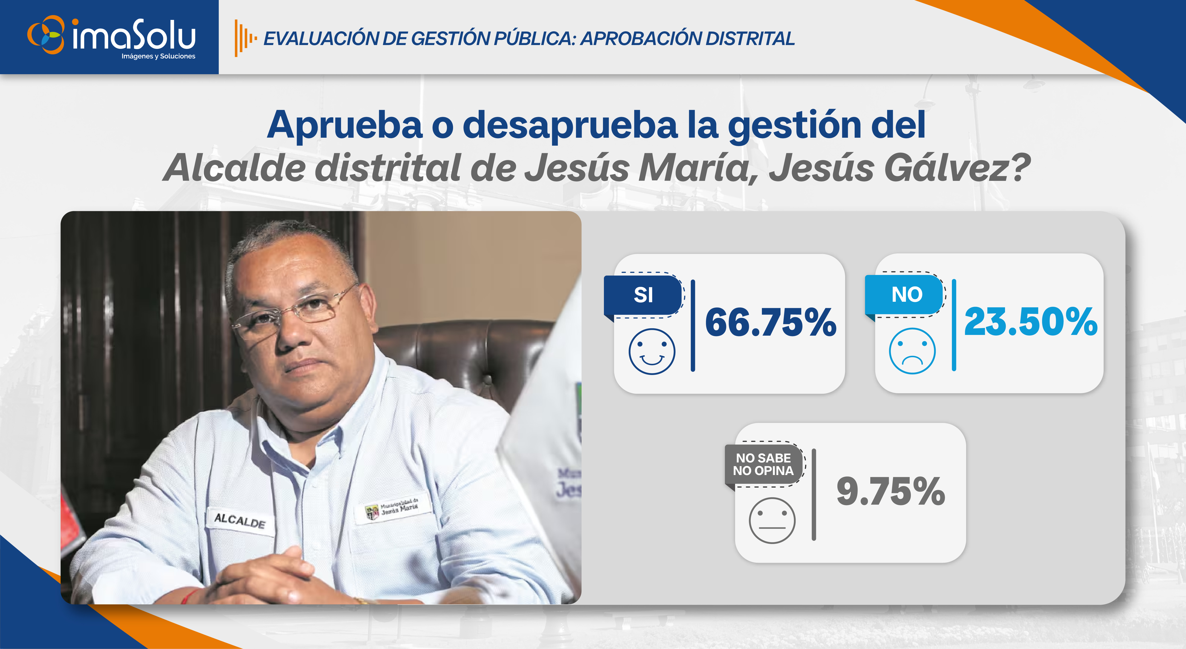 Aplicado en enero de 2026, el estudio muestra que en Jesús María la gestión municipal alcanza un 66.75% de aprobación, mientras que un 23.50% desaprueba la labor del alcalde Jesús Gálvez y un 9.75% de los vecinos señala no saber o no tener una opinión definida.