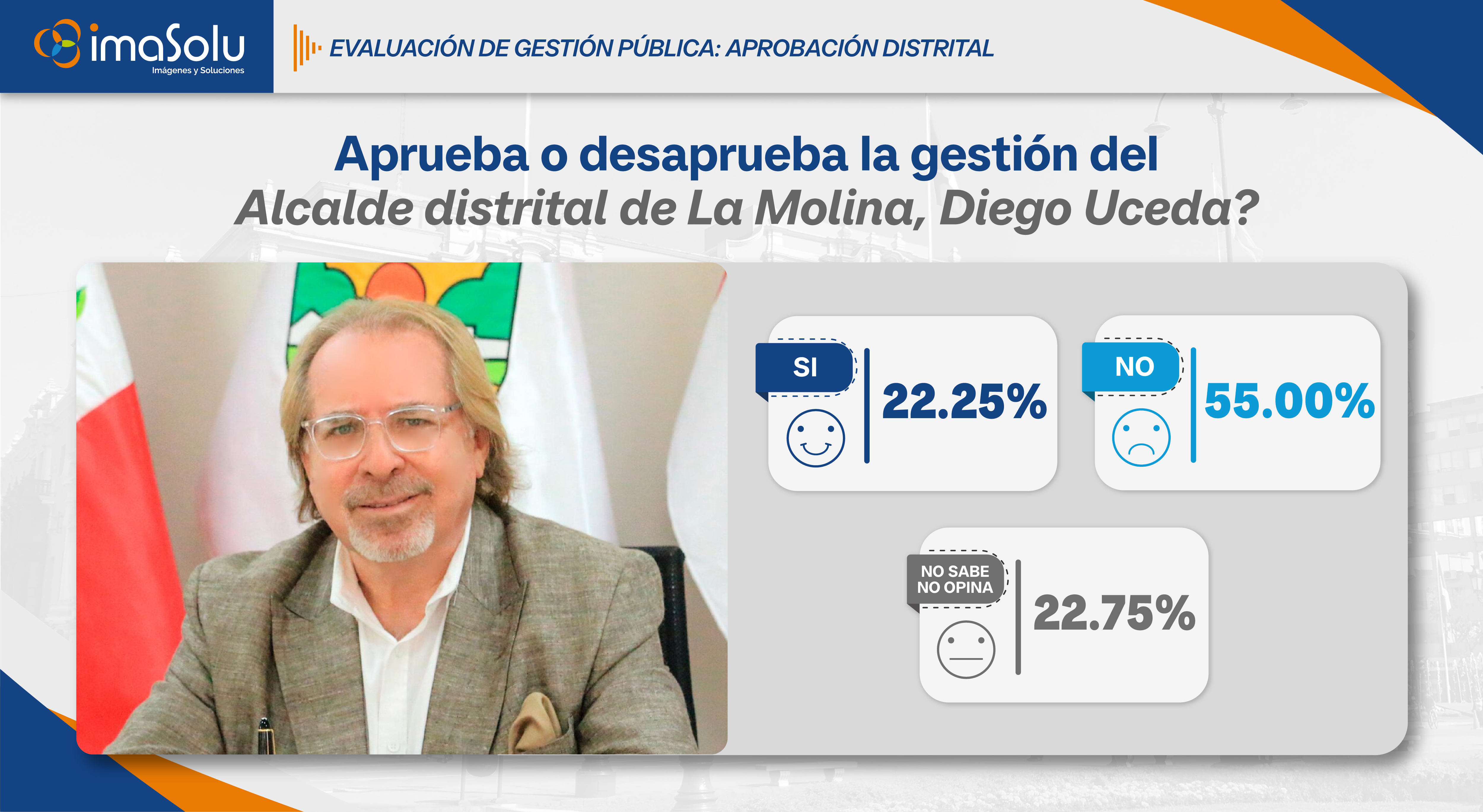Aplicado en enero de 2026, el estudio muestra que en La Molina la gestión municipal del alcalde Diego Uceda,  alcanza un 22.25% de aprobación, mientras que un 55.00% desaprueba la labor del alcalde y un 22.75% de los vecinos señala no saber o no tener una opinión definida.