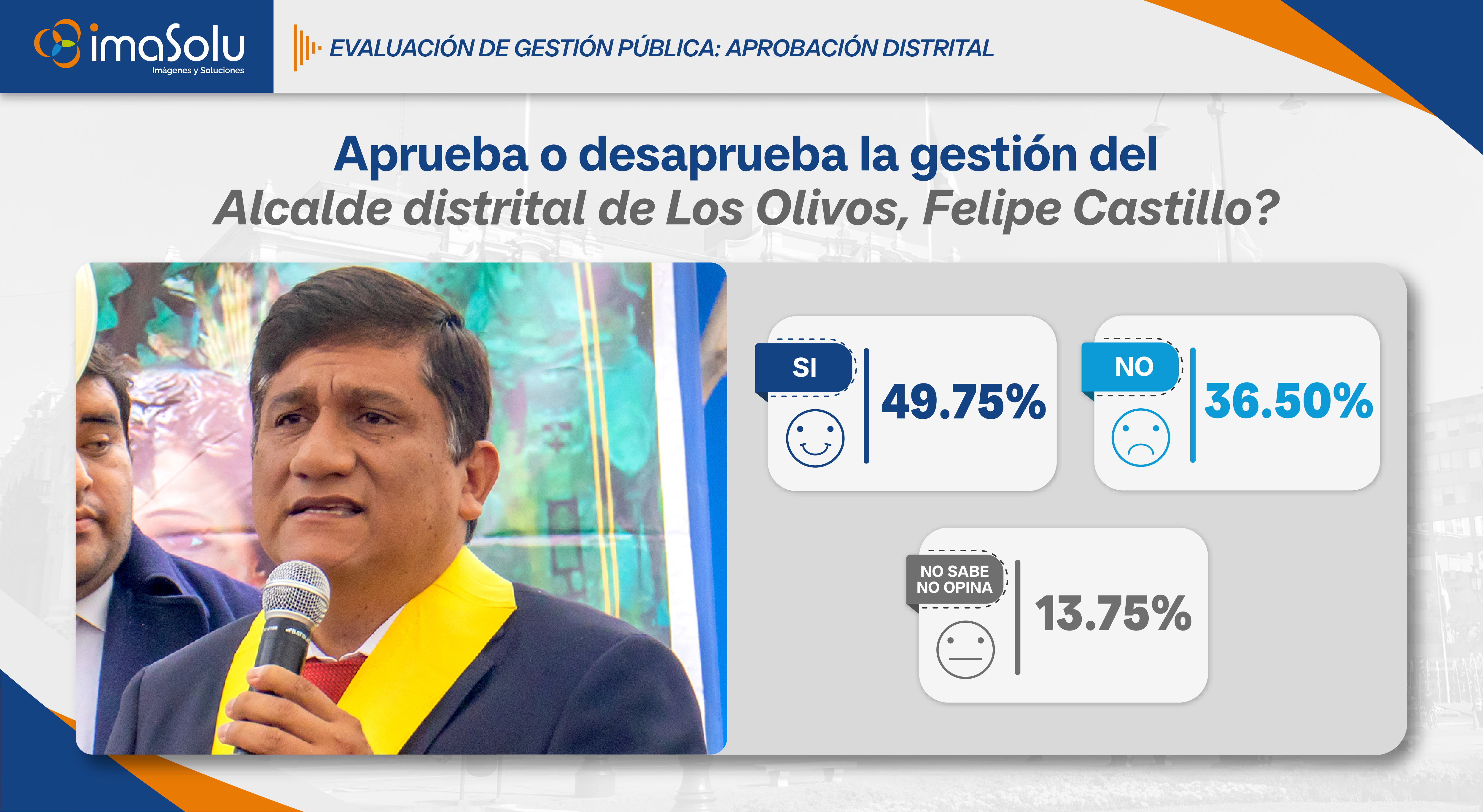 Aplicado en enero de 2026, el estudio muestra que en Los Olivos la gestión municipal del alcalde Felipe Castillo Oliva alcanza un 49.75% de aprobación, mientras que un 36.50% desaprueba su desempeño y un 13.75% de los vecinos señala no saber o no tener una opinión definida.