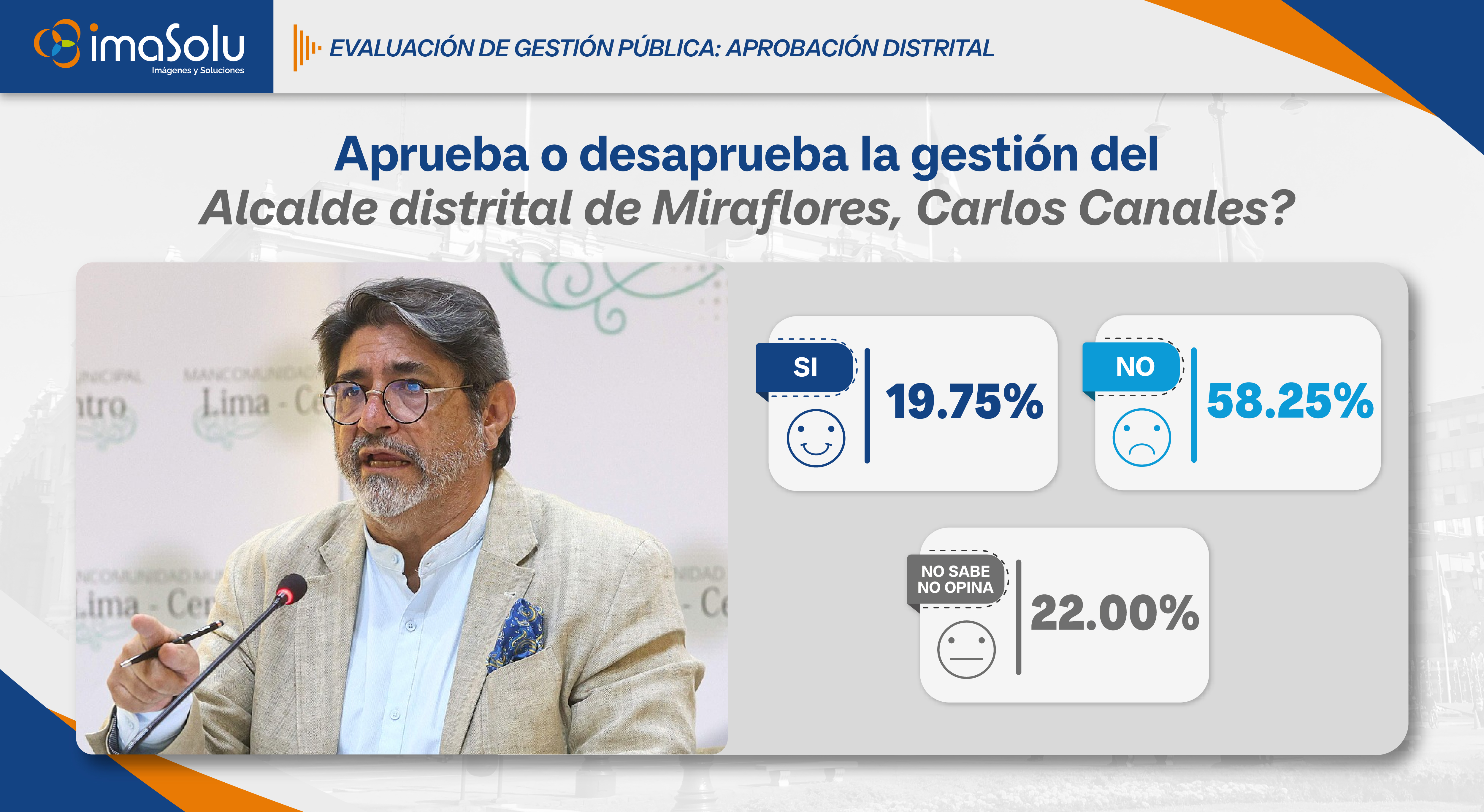 Aplicado en enero de 2026, el estudio muestra que en Miraflores la gestión municipal del alcalde Carlos Canales, alcanza un 19.75% de aprobación, mientras que un 58.25% desaprueba la labor del alcalde y un 22.00% de los vecinos señala no saber o no tener una opinión definida.