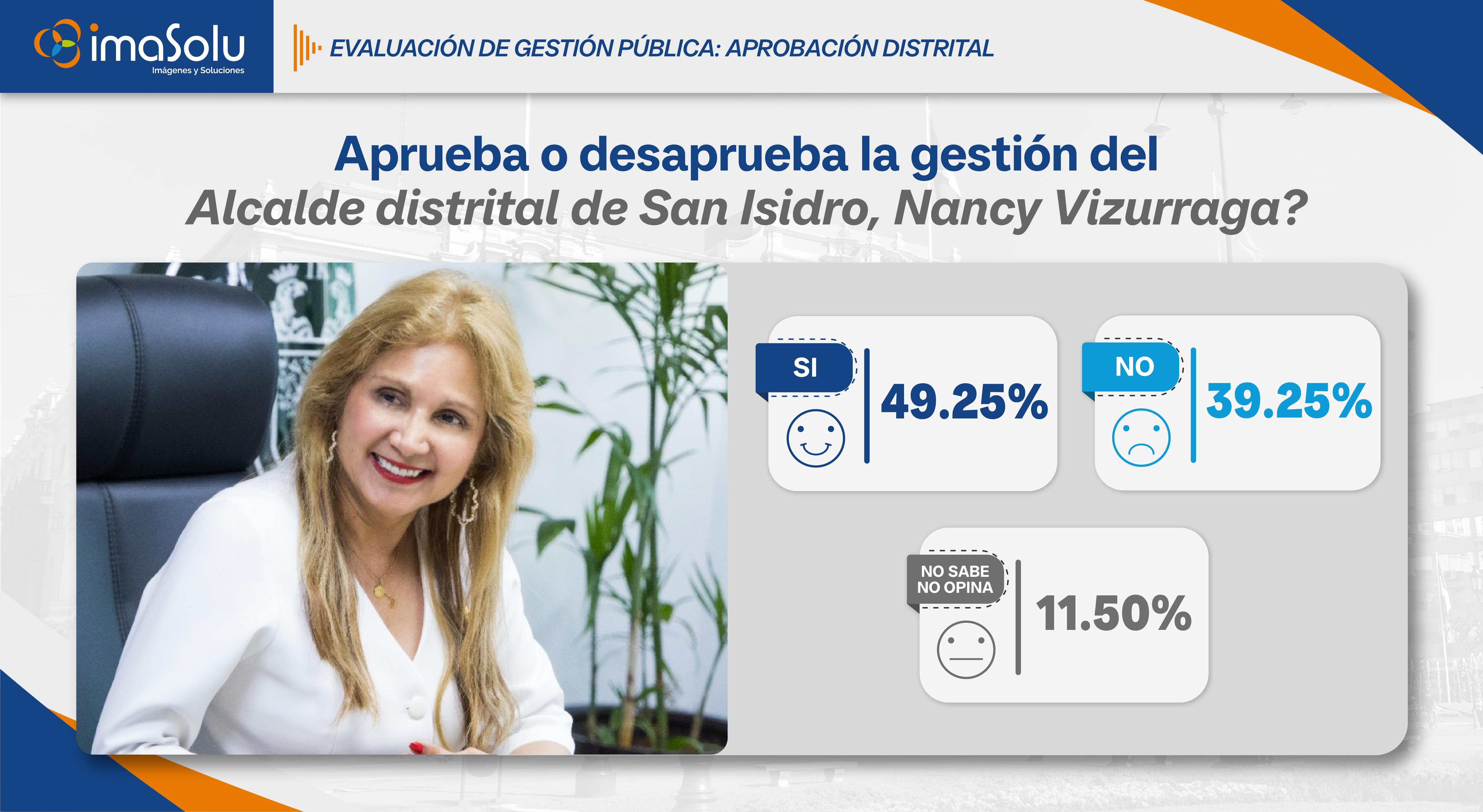 Aplicado en enero de 2026, el estudio muestra que en San Isidro la gestión municipal alcanza un 49.25% de aprobación, mientras que un 39.25% desaprueba la labor de la alcaldesa Nancy Vizurraga y un 11.50% de los vecinos señala no saber o no tener una opinión definida.