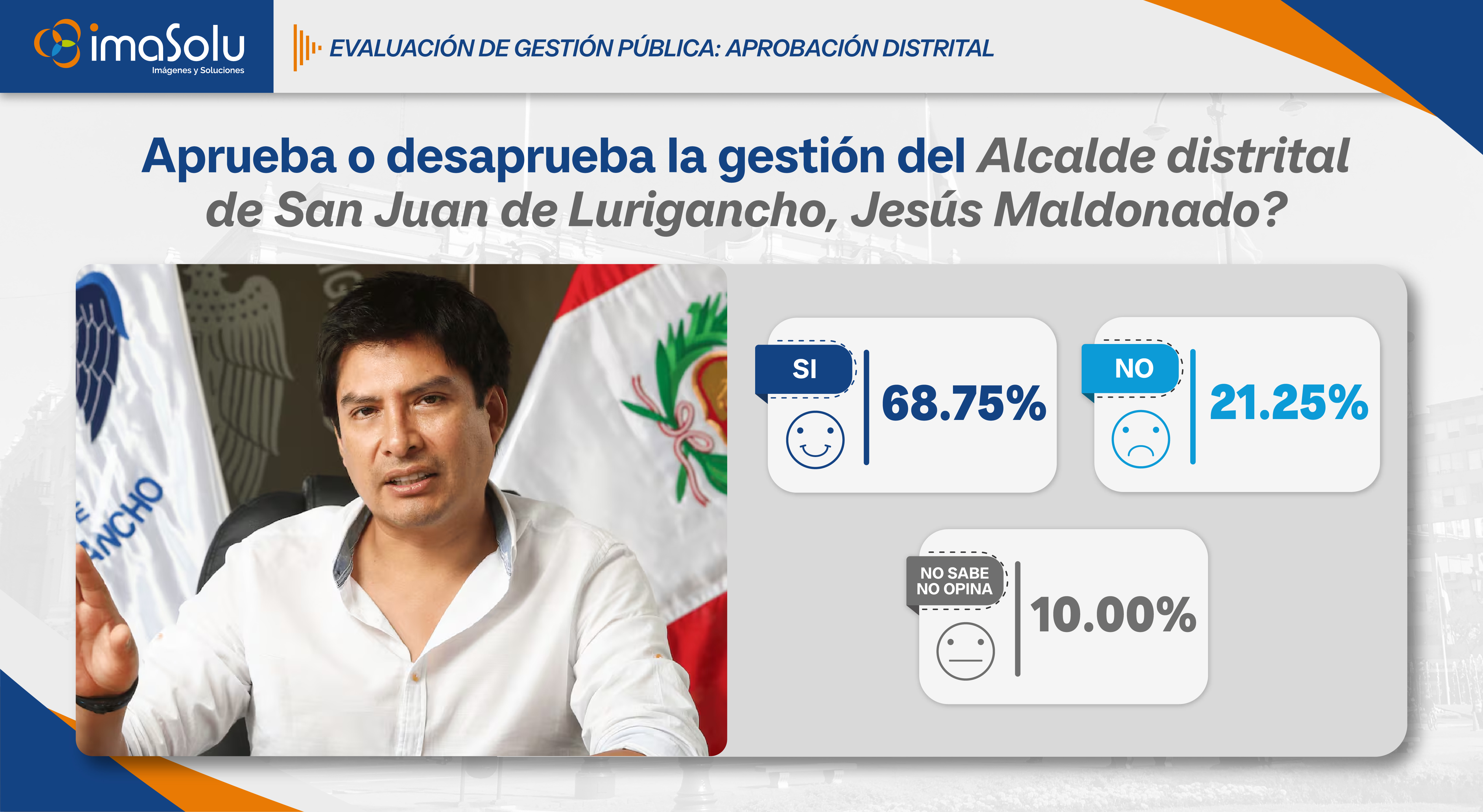 Aplicado en enero de 2026, el estudio muestra que en San Juan de Lurigancho la gestión municipal del alcalde Jesús Maldonado, alcanza un 68.75% de aprobación, mientras que un 21.25% no aprueba la labor del alcalde y un 10.00% de los vecinos señala no saber o no tener una opinión definida.