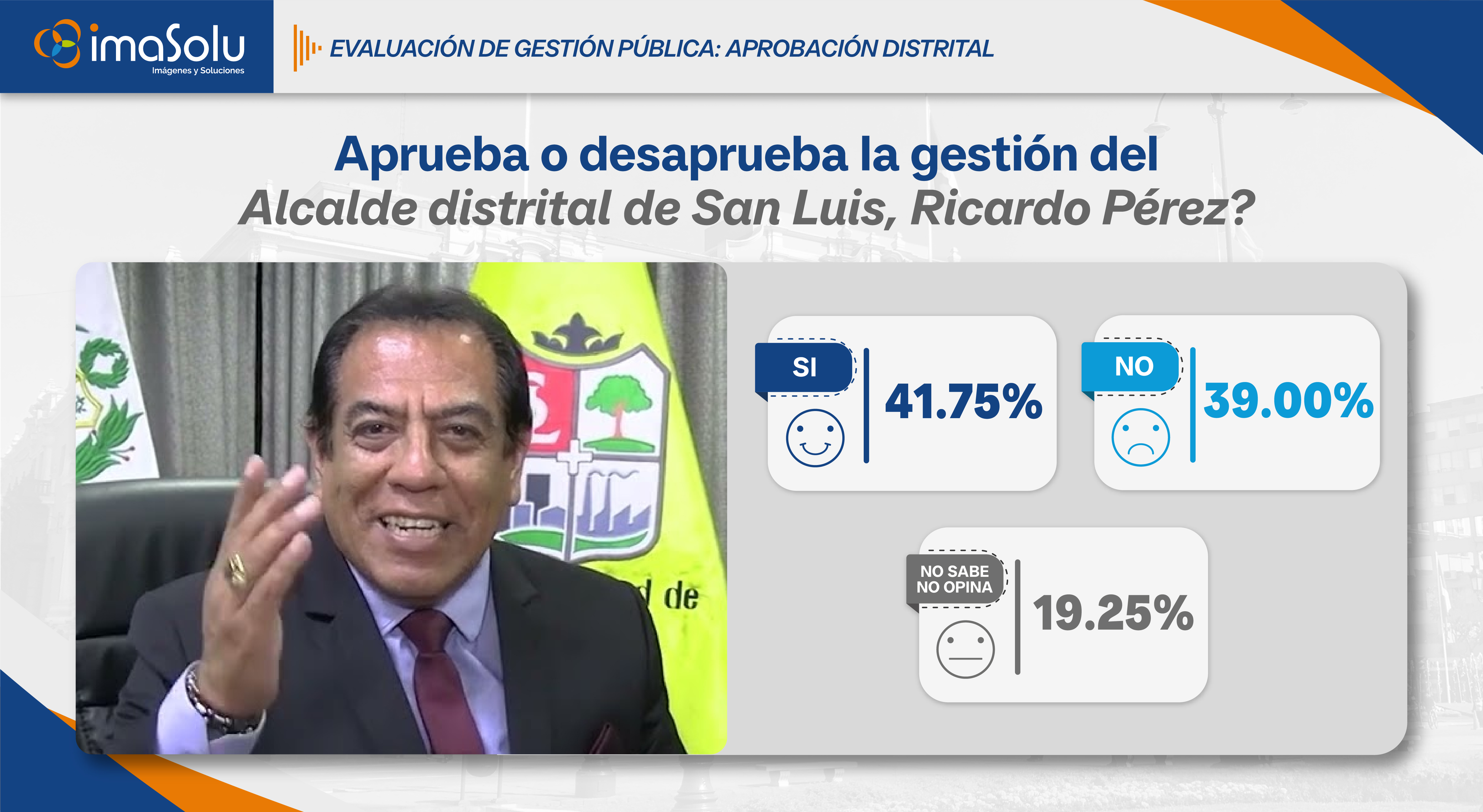 Aplicado en enero de 2026, el estudio muestra que en San Luis la gestión municipal del alcalde Ricardo Peréz alcanza un 41.75% de aprobación, mientras que un 39.00% no aprueba la labor del alcalde y un 19.25% de los vecinos señala no saber o no tener una opinión definida.