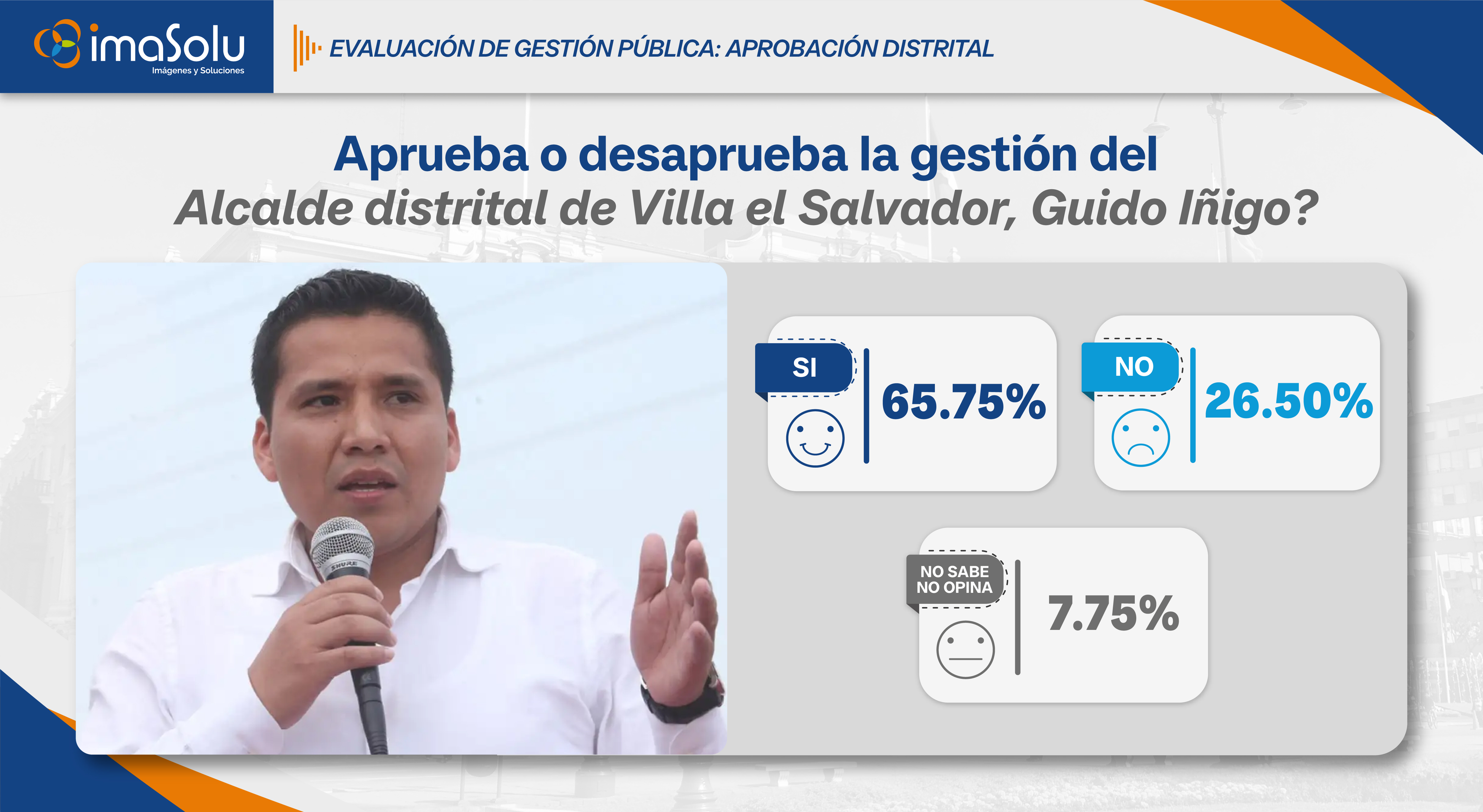 Aplicado en enero de 2026, el estudio muestra que en Villa El Salvador la gestión municipal del alcalde Guido Iñigo alcanza un 65.75% de aprobación, mientras que un 26.50% desaprueba la labor del alcalde y un 7.75% de los vecinos señala no saber o no tener una opinión definida.