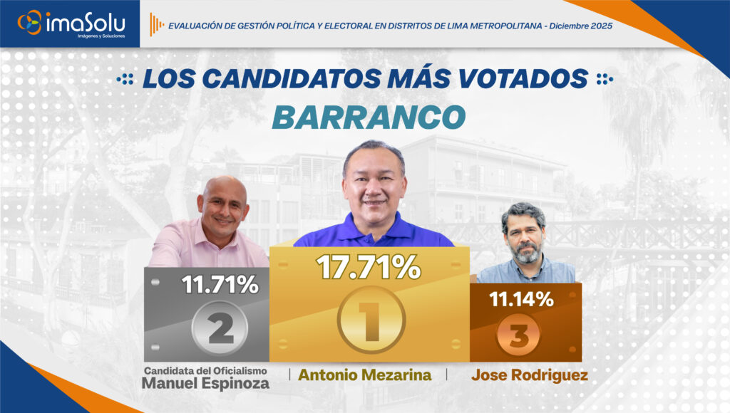 Según la Encuesta de elecciones Lima 2026 de IMASOLU, aplicada en diciembre de 2025, se identifican los tres primeros lugares de intención de voto en el distrito de Barranco (BARRANCO). De acuerdo con los resultados, Antonio Mezarina concentra 17.71% de las preferencias, seguido por Manuel Espinoza con 11.71%, mientras que José Rodríguez alcanza 11.14%.