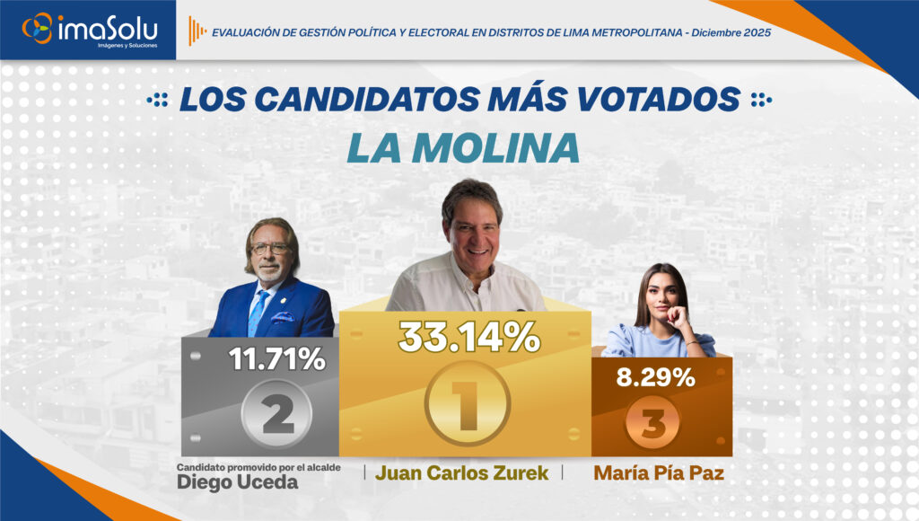 Según la Encuesta de elecciones Lima 2026 de IMASOLU, aplicada en diciembre de 2025, se identifican los tres primeros lugares de intención de voto en el distrito de La Molina (LM). De acuerdo con los resultados, Juan Carlos Zurek concentra 33.14% de las preferencias, seguido por el candidato promovido por el alcalde Diego Uceda con 11.71%, mientras que María Pía Paz alcanza 8.29%.