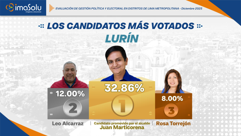 Según la Encuesta de elecciones Lima 2026 de IMASOLU, aplicada en diciembre de 2025, se identifican los tres primeros lugares de intención de voto en el distrito de Lurín (LUR). De acuerdo con los resultados, el candidato promovido por el alcalde Juan Raúl Marticorena concentra 32.86% de las preferencias, seguido por Leo Alcarraz con 12.00%, mientras que Rosa Torrejón alcanza 8.00%.