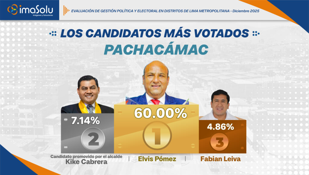 Según la Encuesta de elecciones Lima 2026 de IMASOLU, aplicada en diciembre de 2025, se identifican los tres primeros lugares de intención de voto en el distrito de Pachacámac. De acuerdo con los resultados, Elvis Pómez concentra el 60.00% de las preferencias, seguido por Kike Cabrera con 7.14%, mientras que Fabián Leiva alcanza 4.86%.