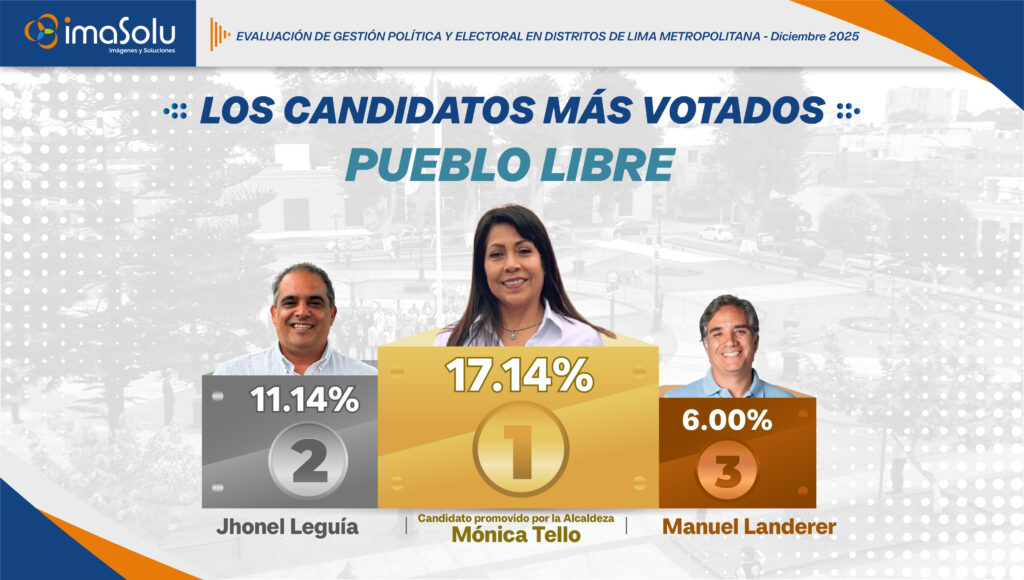 Según la Encuesta de elecciones Lima 2026 de IMASOLU, aplicada en diciembre de 2025, se identifican los tres primeros lugares de intención de voto en el distrito de Pueblo Libre (PL). De acuerdo con los resultados, el candidato promovido por la alcaldesa Mónica Tello concentra 17.14% de las preferencias, seguido por Jhonel Leguía con 11.14%, mientras que Manuel Landerer alcanza 6.00%.