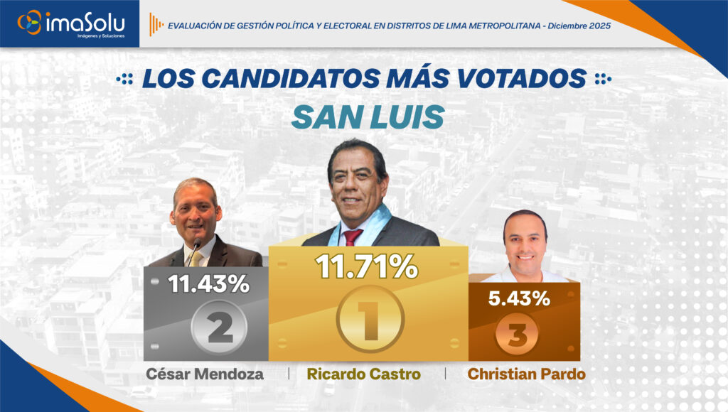 Según la Encuesta de elecciones Lima 2026 de IMASOLU, aplicada en diciembre de 2025, se identifican los tres primeros lugares de intención de voto en el distrito de San Luis (SL). De acuerdo con los resultados, Ricardo Castro concentra 11.71% de las preferencias, seguido muy de cerca por César Mendoza con 11.43%, mientras que Christian Pardo alcanza 5.43%.