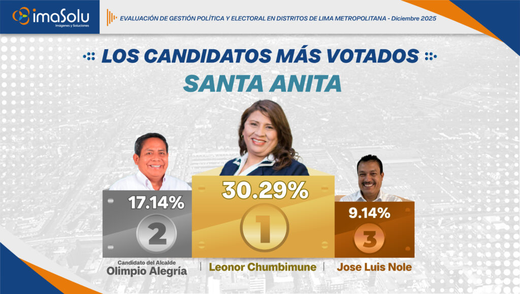 Según la Encuesta de elecciones Lima 2026 de IMASOLU, aplicada en diciembre de 2025, se identifican los tres primeros lugares de intención de voto en el distrito de Santa Anita (SA). De acuerdo con los resultados, Leonor Chumbimune concentra 30.29% de las preferencias, seguida por el candidato promovido por el alcalde Olimpio Alegría con 17.14%, mientras que José Luis Nole alcanza 9.14%.