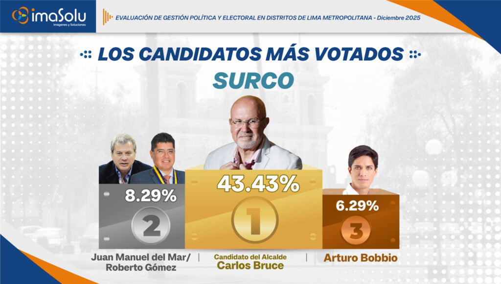 Según la Encuesta de elecciones Lima 2026 de IMASOLU, aplicada en diciembre de 2025, se identifican los tres primeros lugares de intención de voto en el distrito de Santiago de Surco (Surco). De acuerdo con los resultados, el candidato promovido por el alcalde Carlos Bruce concentra 43.43% de las preferencias, seguido por la dupla Juan Manuel del Mar / Roberto Gómez con 8.29%, mientras que Arturo Bobbio alcanza 6.29%.