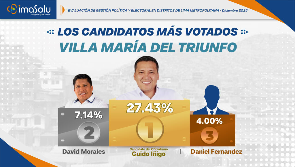 Según la última Encuesta de elecciones Lima 2026 de Imasolu aplicada en diciembre de 2025, se identifican los tres primeros lugares de intención de voto en el distrito de Villa María del Triunfo (VMT). De acuerdo con los resultados, el candidato del oficialismo, Guido Iñigo, concentra 27.43% de las preferencias, seguido por David Morales con 7.14%, mientras que Daniel Fernández alcanza 4.00%.