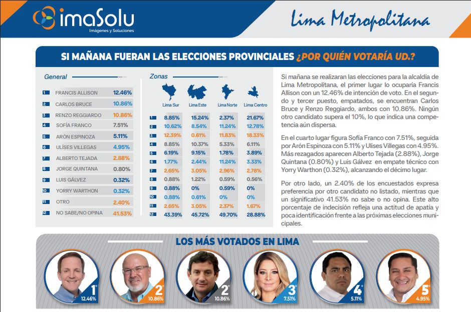 De cara a las próximas elecciones municipales en Lima Metropolitana, Francis Allison encabeza la intención de voto con un 12.46%, seguido por Carlos Bruce y Renzo Reggiardo, ambos con 10.86%, en un empate técnico. En cuarto lugar se ubica Sofía Franco con 7.51%, seguida por Arón Espinoza con 5.11%. A partir del sexto lugar, ningún candidato supera el 5%: Ulises Villegas alcanza 4.95%, Alberto Tejada 2.88%, Jorge Quintana 0.80%, y tanto Luis Gálvez como Yorry Wharton registran 0.32%. Un 2.40% menciona a otros candidatos, y el 41.63% aún no define su voto.