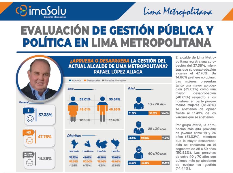 Por zonas de Lima, López Aliaga obtiene su mayor aprobación en Lima Este (41.46%), mientras que en Lima Norte alcanza su mayor nivel de desaprobación (55.03%). En Lima Sur, destaca el alto porcentaje de personas que se abstienen de opinar: 23.89%.
