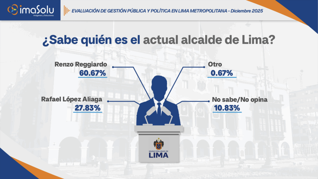 El 60.67% de los encuestados supo responder quien es el actual alcalde de Lima Metropolitana, mientras e 27.83% aun asociaba la alcaldía con Rafael López Aliaga. Según nuestra encuesta de elecciones provinciales Lima 2026 de diciembre del 2025.