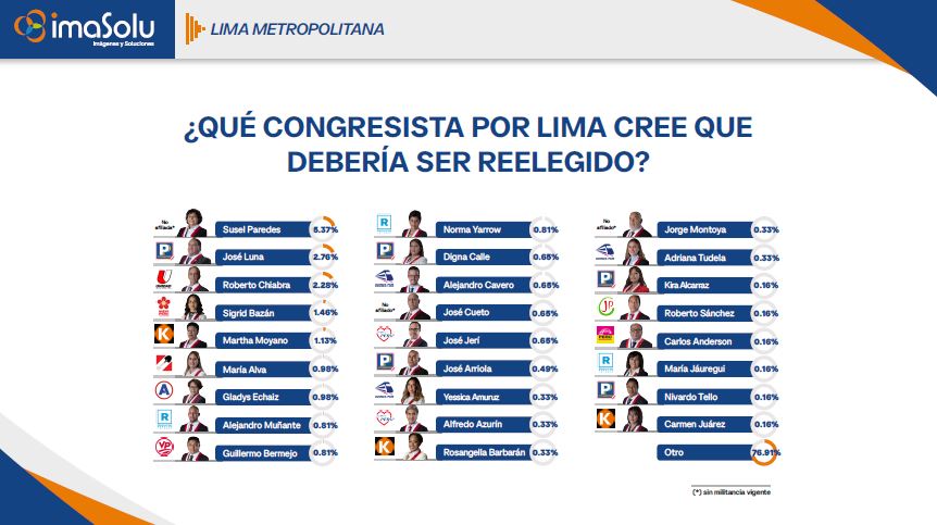 La ciudadanía reconoce a muchos de los parlamentarios —por su presencia en medios, redes o conflictos—, pero eso no se traduce en voluntad de continuidad. Esto pone de relieve que el rechazo no es hacia individuos aislados, sino hacia el Congreso como institución. Incluso el primer lugar ,Susel Paredes, que lidera la intención de reelección con 5.37 %, apenas concentran una fracción minoritaria del apoyo total. Y pese a ello, es quien se distancia más del resto.