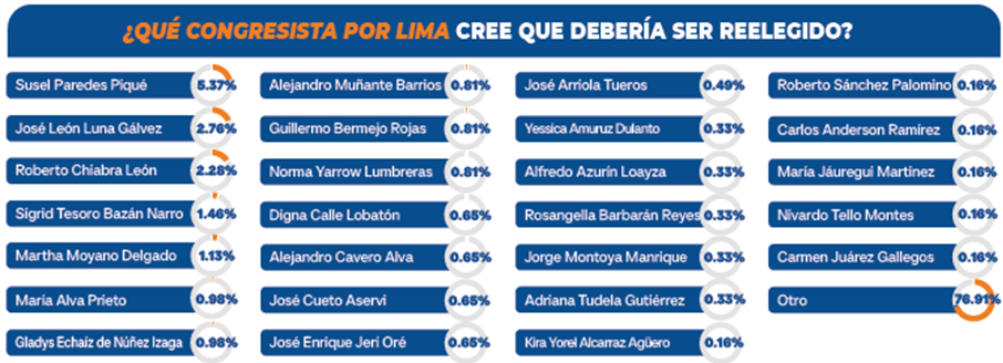 En cuanto a la pregunta ¿Qué Congresista por Lima cree que debería ser reelegido?, el electorado de Lima Metropolitana pone en primer lugar a Susel Paredes Piqué con 5.37%, seguida de José León Luna Gálvez con 2.76% y tercero Roberto Chiabra León con 2.28%.