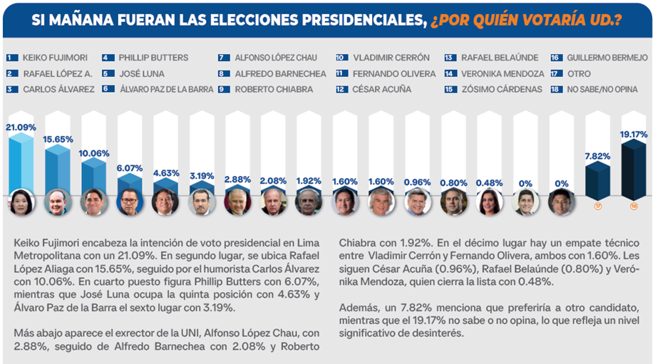 En cuanto a la pregunta de “Si mañana fueran las elecciones presidenciales, ¿Por quién votaría Ud.?, Keiko Fujimori logra liderar la lista con un 21.09%, Rafael López A. llega al 15.65% y Carlos Álvarez logra un 10.06%